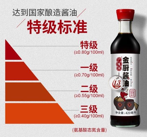 金廚醬油鮮度檢測數(shù)據(jù)顯示,“金廚醬油”氨基酸態(tài)氮含量≥1.3g/100ml,遠遠高于國家醬油釀造標準的0.8g/100ml特級標準,“鮮醇”度遠超國家標準,產出地地道道的頭道新鮮原釀。
