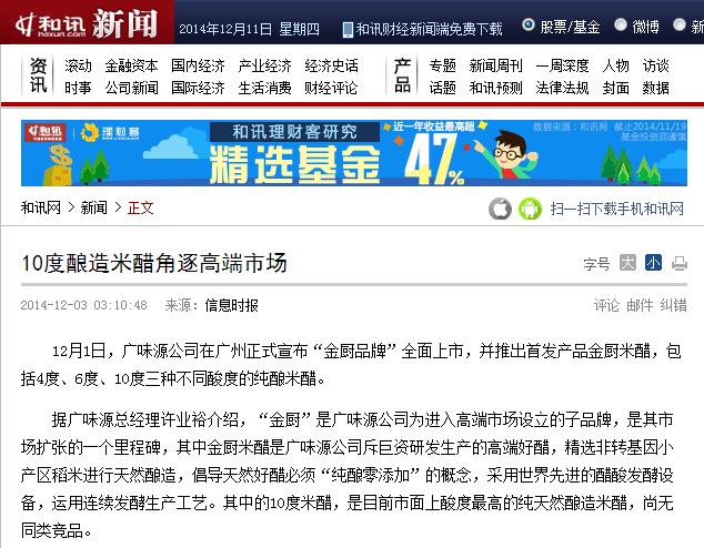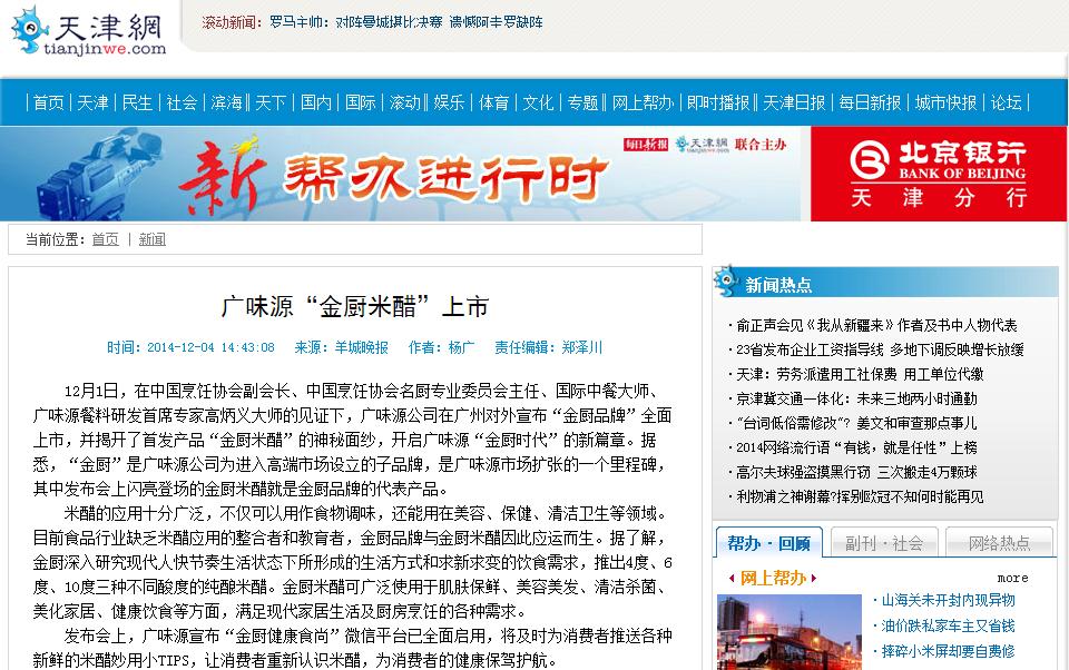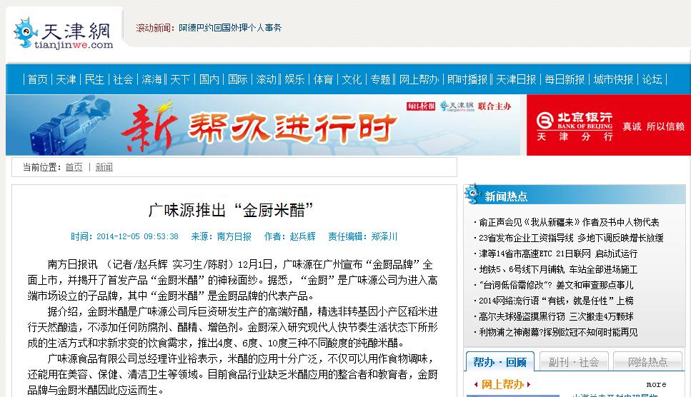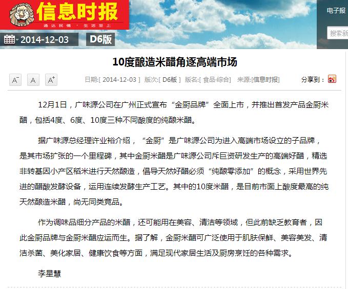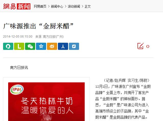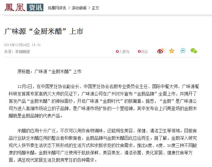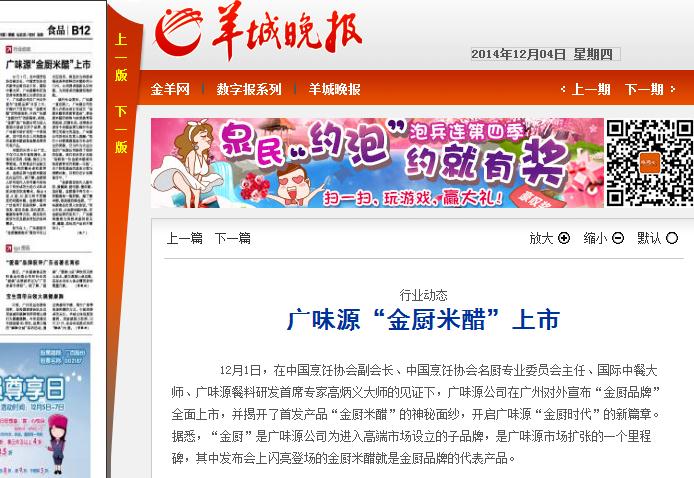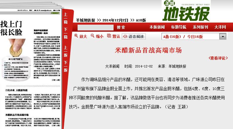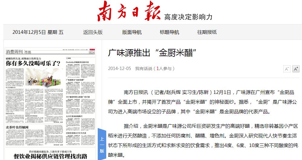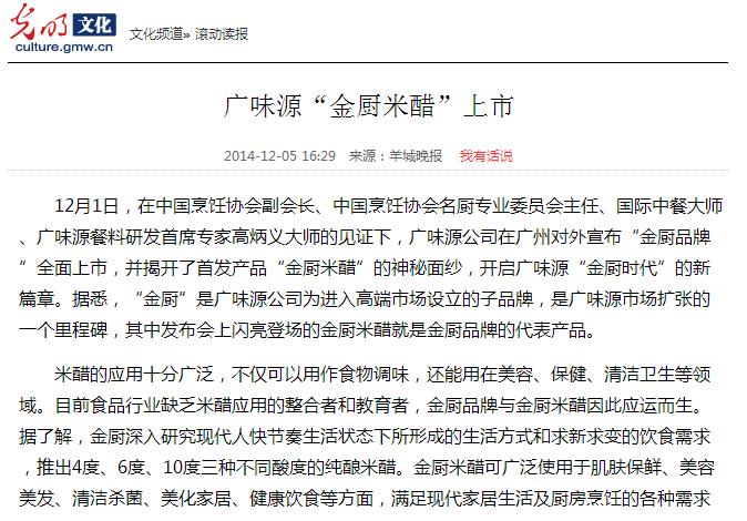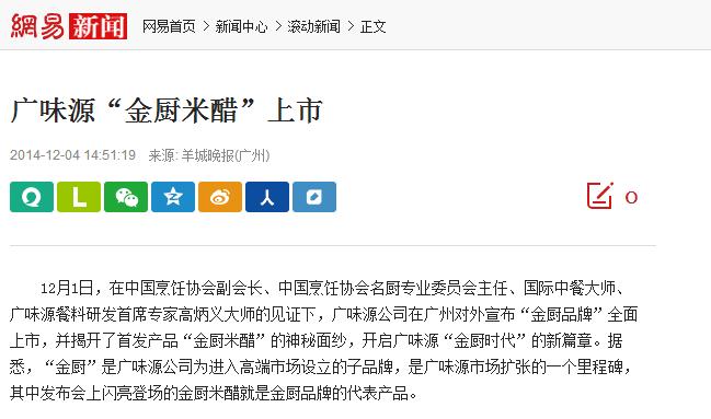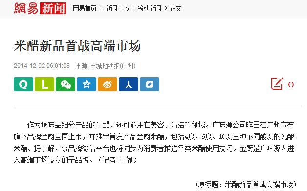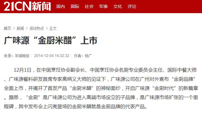 廣州日報、羊城晚報、南方日報、羊城地鐵報、信息時報等傳統(tǒng)主流媒體,以及網易、鳳凰網、21CN新聞網、證券之星、天津網、和訊新聞、光明網等新媒體也及時刊登了“金廚品牌上市”、“金廚米醋閃亮登場”等相關新聞。