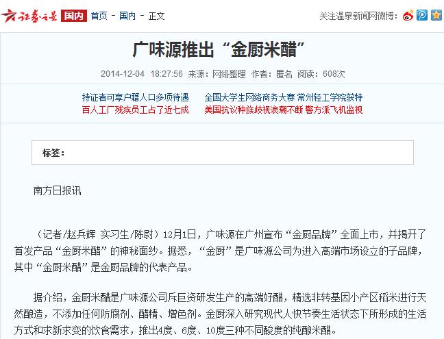 12月初,廣味源公司在廣州宣布“金廚品牌”全面上市,并揭開了首發(fā)產品“金廚米醋”的神秘面紗。